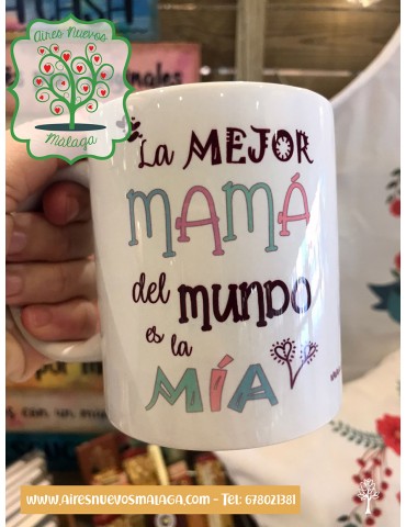 TAZA "LA MEJOR MAMÁ DEL MUNDO ES LA MÍA" Tazas de cerámica para lavavajillas y microondas.Capacidad 33 cl.Medidas 28 x 8 cm. Envíos en toda España.
