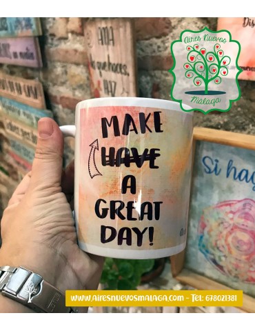 TAZA "MAKE A GREAT DAY!" Tazas de cerámica para lavavajillas y microondas.Capacidad 33 cl.Medidas 28 x 8 cm. Envíos en toda España.