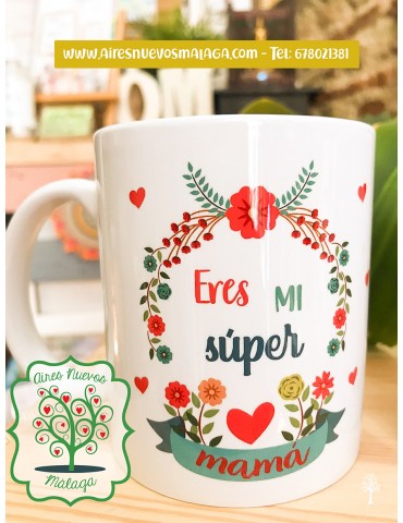 TAZA "ERES MI SÚPER MAMÁ" Tazas de cerámica para lavavajillas y microondas.Capacidad 33 cl.Medidas 28 x 8 cm. Envíos en toda España.