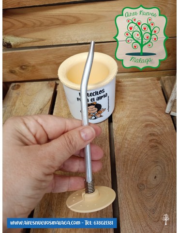 Bombilla incluida de acero inoxidable con resorte para facilitar el consumo del mate (no se tapa).
