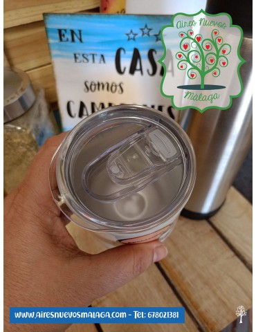 Con tapa de plástico que cierra a presión y tiene un orificio para meter la bombilla o poder beber a través de él.