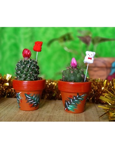 1 maceta con un cactus. La maceta es de cerámica/barro y está pintada a mano.
