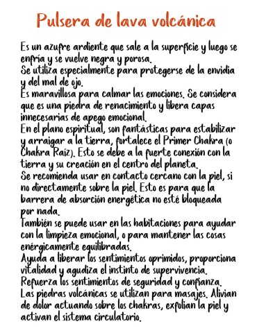 Se utiliza especialmente para protegerse de la envidia y del mal de ojo. Es maravillosa para calmar las emociones. Se considera que es una piedra de renacimiento y libera capas innecesarias de apego emocional. En el plano espiritual, son fantásticas para estabilizar y arraigar a la tierra, fortalece el Primer Chakra (o Chakra Raíz). Esto se debe a la fuerte conexión con la tierra y su creación en el centro del planeta. Se recomienda usar en contacto cercano con la piel, si no directamente sobre la piel. Esto es para que la barrera de absorción energética no esté bloqueada por nada. También se puede usar en las habitaciones para ayudar con la limpieza emocional, o para mantener las cosas enérgicamente equilibradas. Ayuda a liberar los sentimientos oprimidos, proporciona vitalidad y agudiza el instinto de supervivencia. Refuerza los sentimientos de seguridad y confianza. Las piedras volcánicas se utilizan para masajes. Alivian de dolor actuando sobre los chakras, exfolian la piel y activan el sistema circulatorio.